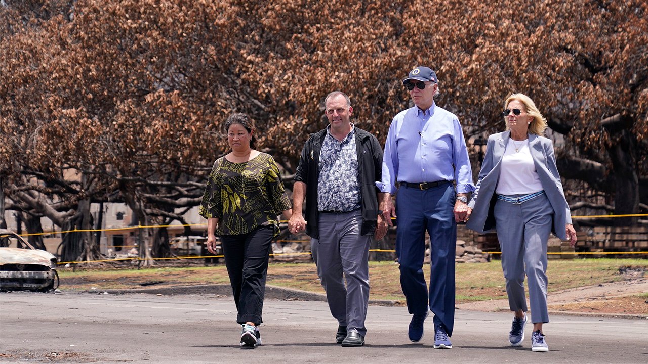 President Joe Biden and first lady Jill Biden walk with Hawaii Gov. Josh Green, second from left, and his wife Jaime Green as they pass the massive Banyan tree while visiting areas devastated by the Maui wildfires, Aug. 21, 2023, in Lahaina, Hawaii. (AP)