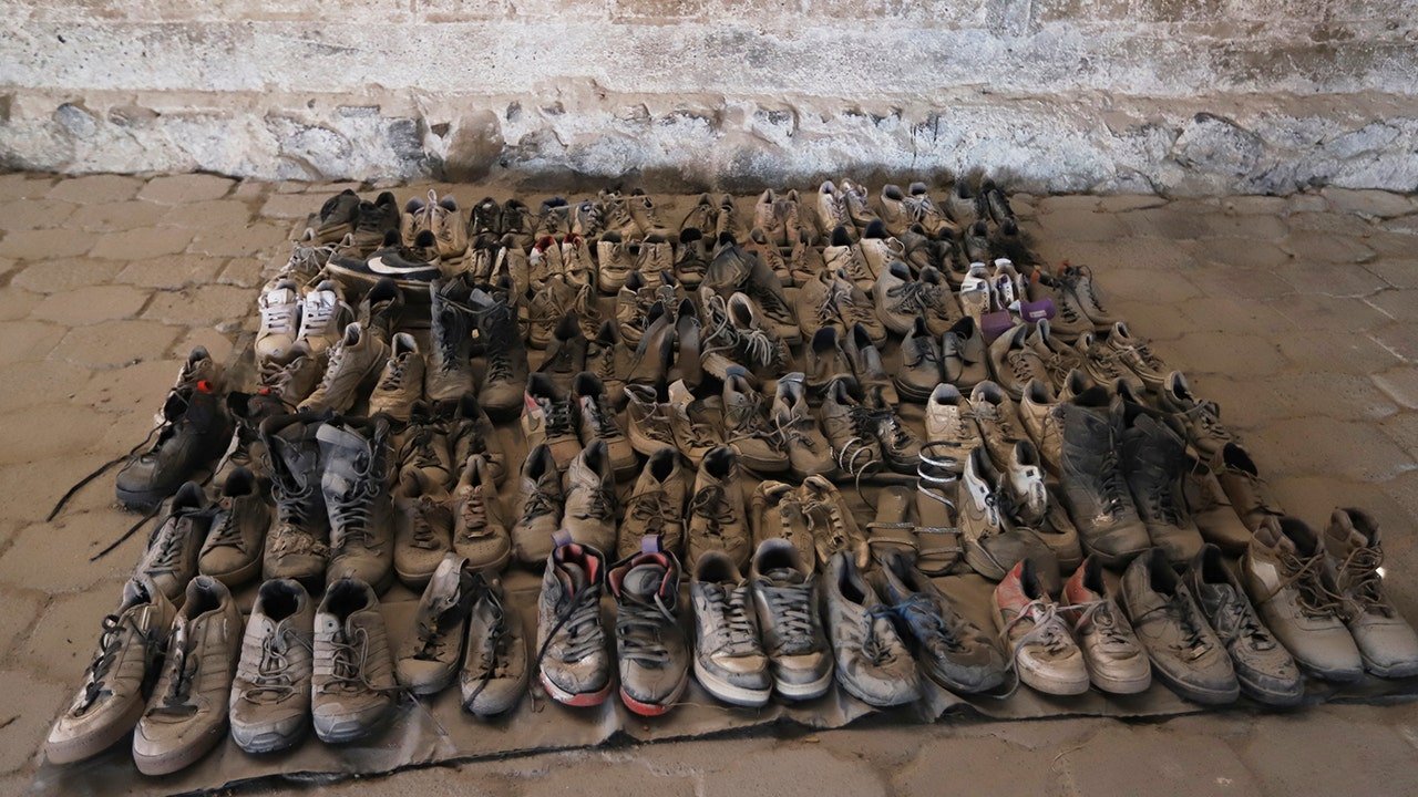 This photo released by the Jalisco State Attorney General’s Office shows shoes at the Izaguirre Ranch where skeletal remains were also discovered in the municipality of Teuchitlan, Mexico, March 11. (Jalisco State Attorney General’s Office via AP)