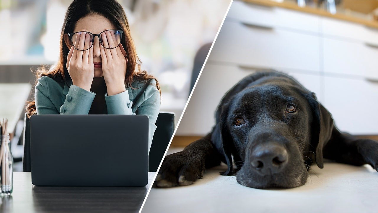 A woman pinches the bridge of her nose in frustration while working from home. A 2025 study published in Scientific Reports links job stress and rumination to signs of stress in pet dogs. (Getty Images)